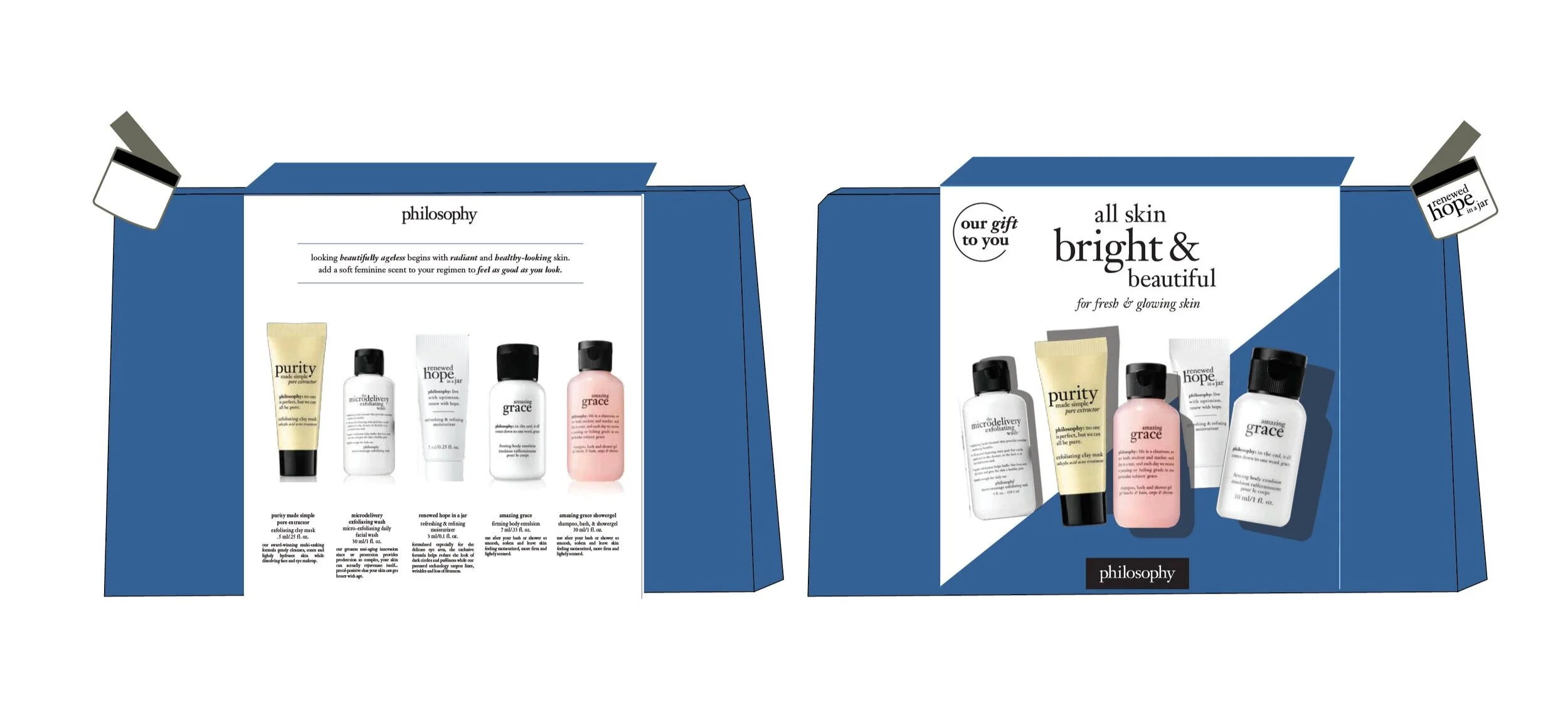 Fronts featured hero imagery and the signature “Philosophy” branding, while backs summarized the kit’s purpose and highlighted included products. Mini cloth bags incorporated enamel pull tabs mimicking iconic products.